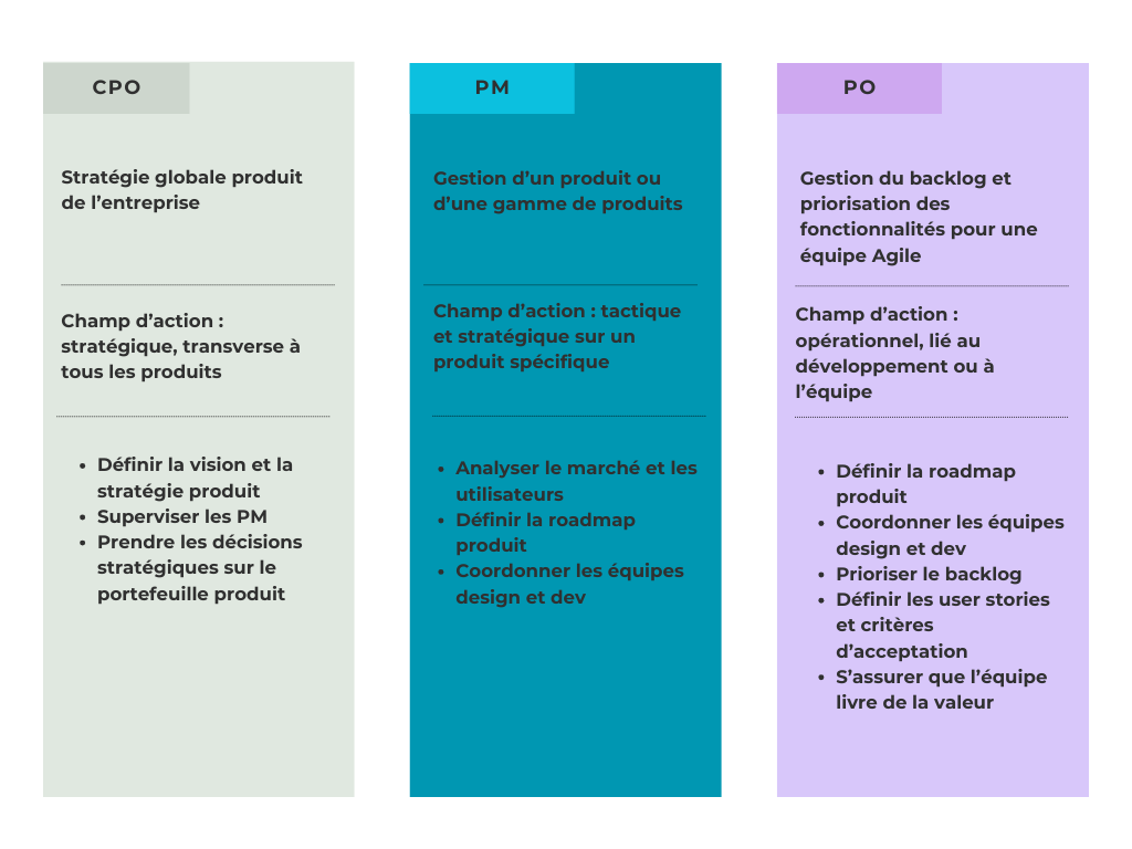 Pour résumer, les fonctions sont très proches sur le papier. Le PO est plus orienté technique et opérationnel. Il parle le même langage que ses subordonnés. Il est proche (physiquement) du produit et n'hésite pas à mettre la main à la patte. A contrario, le PM a plus un rôle de manager, plus proche des enjeux stratégiques en respectant les budgets et les différents pôles de l'entreprise (financier, marketing...). Il est donc en relation avec les responsables de chaque secteur, avec la direction et surtout avec les utilisateurs produits. Enfin, le CPO est au dessus des deux précédents dans l'organisation. S'il existe plusieurs produits dans une entreprise, il y a généralement un CPO par produit.